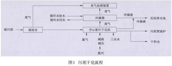 通過對污泥性質(zhì)的分析,同時綜合當前行業(yè)處理技術(shù)的對比,將原污泥工藝流程“沉降濃縮+機械脫水+焚燒”工藝改進為“沉降濃縮+機械脫水+干化+焚燒”的工藝。通過增加污泥干化過程,降低進入污泥焚燒爐的泥餅含水率,大幅度縮減污泥量,提高污泥熱值,節(jié)約焚燒爐燃料的同時保證污泥焚燒的效果,產(chǎn)生的廢氣經(jīng)收集后再處理。