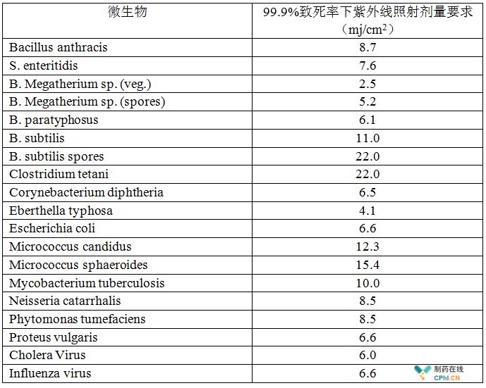 殺菌效果是由微生物所接受的照射劑量決定的,表一是不同微生物對(duì)于紫外線輻射劑量的要求。